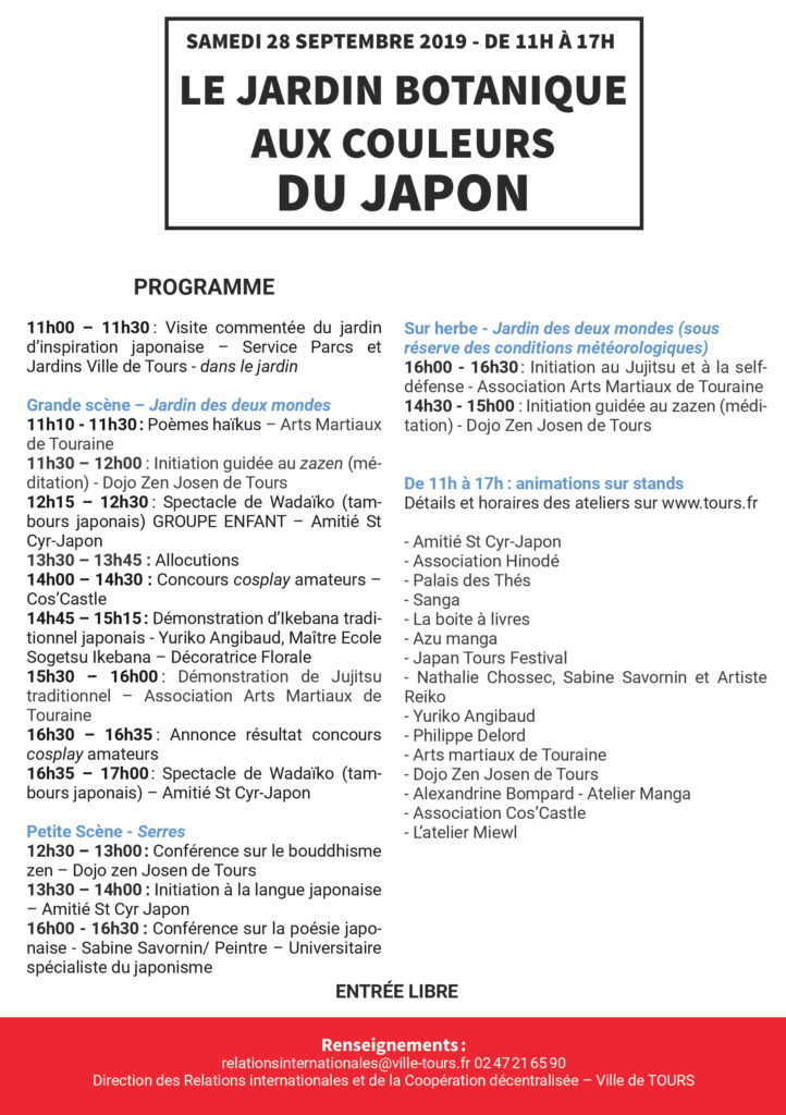 Vous trouverez ci-après le retour en images de cette belle journée ! Le jardin botanique aux couleurs du Japon (29 septembre 2018) (lien direct) ou alors : https://www.tours.fr/action-municipale/49-tours-a-l-international.htm rubrique Retour sur les derniers événements et lien Jardin botanique aux couleurs du Japon